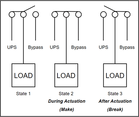 Figure 2 above highlights the transition of the UPS output to the Bypass Switch output in the Make Before Break Configuration. The details of each state are as follows: